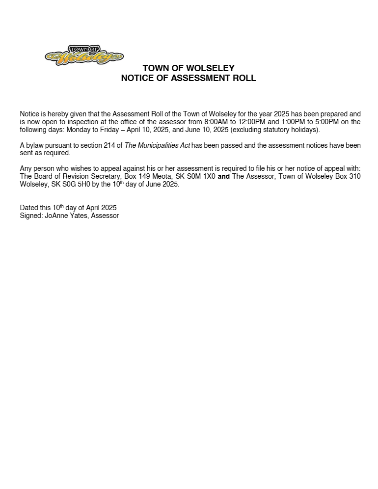 • If you do not receive your tax notice by August 31, please contact the Town Office at (306) 698-2477 or email townofwolseley@sasktel.net
